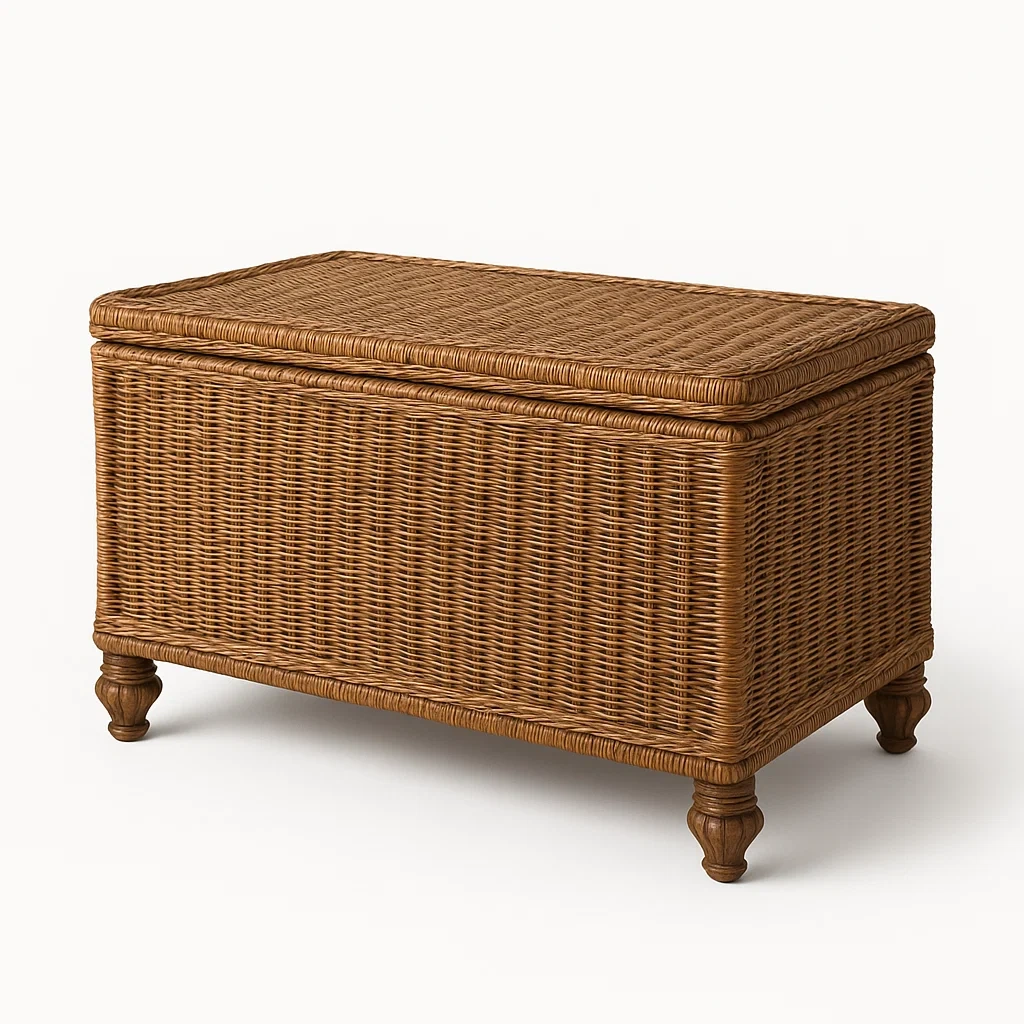 Este baúl de almacenamiento está hecho de ratán natural, ofreciendo un espacio elegante y funcional. Sus dimensiones son 90 cm de longitud, 50 cm de anchura y 50 cm de altura. La estructura principal es de ratán con un acabado natural. El color marrón le da un estilo cálido y acogedor. El baúl tiene un peso neto de 12 kg.